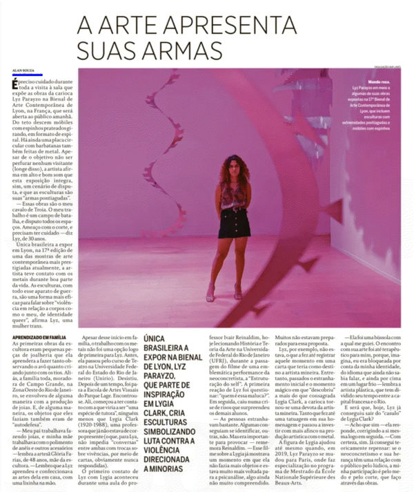 LYZ PARAYZO [1994, Rio de Janeiro, Brasil. Vive e trabalha em São Paulo, Brasil e Paris, França]. Estudou teatro na Universidade Federal do Rio de Janeiro (UNIRIO), formou-se como artista visual na EAV Parque Lage (Escola de Artes Visuais do Parque Lage) e tem mestrado em artes plásticas pela École Nationale Supérieure des Beaux-Arts de Paris. Exposições individuais selecionadas: Cuir Mouvement, École nationale supérieure des Beaux-arts de Paris, Paris, França (2022); Porno Chic, curadoria de Pascal Rousseau, Espace L, Genebra, Suíça (2021); Cuir Popcreto, Maus Hábitos, Porto, Portugal (2020); Lyz 40°, Galeria Vila Aymoré, Rio de Janeiro, Brasil (2019). Exposições coletivas selecionadas: Um Enorme Passado pela Frente, curadoria de Cristina Tejo, Plataforma Revólver, Lisboa, Portugal (2022); Tu m’ouvres tes bras et on fait um pays, curadoria de Ulisses Carrilho, Galerie Ilian Rebei, Paris, França (2022); We Killed the Bunny, Galeria Baró, Palma de Maiorca, Espanha (2022); Watú não está morto, Instituto de Estudos Brasileiros, Universidade de São Paulo, São Paulo, Brasil (2022); Carolina Maria de Jesus: um Brasil para os brasileiros, SESC Sorocaba, Sorocaba, Brasil (2022); Atelier Anne Rochette/École Nationale Supérieure des Beaux-Arts de Paris, Paris, França, (2022); Novas Aquisições, curadoria de Valéria Piccoli, Pinacoteca do Estado de São Paulo, São Paulo, Brasil (2022); Por muito tempo acreditei ter sonhado que era livre, curadoria de Priscyla Gomes, Instituto Tomie Oktake, São Paulo, Brasil (2022); Carolina Maria de Jesus: um Brasil para os brasileiros, curadoria de Hélio Menezes e Raquel Barreto, Instituto Moreira Salles, São Paulo, Brazil (2021); Trojan Horse Behind Glass/Chapter II: Cuir Cuir, curadoria de Laila Melchior, NICC, Bruxelas, Bélgica (2021); Demain será un autre jour, curadoria de Sofia Lanusse, Les Grandes-Serres de Pantin, Paris, França (2020); Histórias Feministas: Artistas depois de 2000, curadoria de Isabella Rjeille, Museu de Arte de São Paulo Assis Chateaubriand, São Paulo, Brasil (2019). Coleções públicas: Pinacoteca de São Paulo, São Paulo, Brasil.