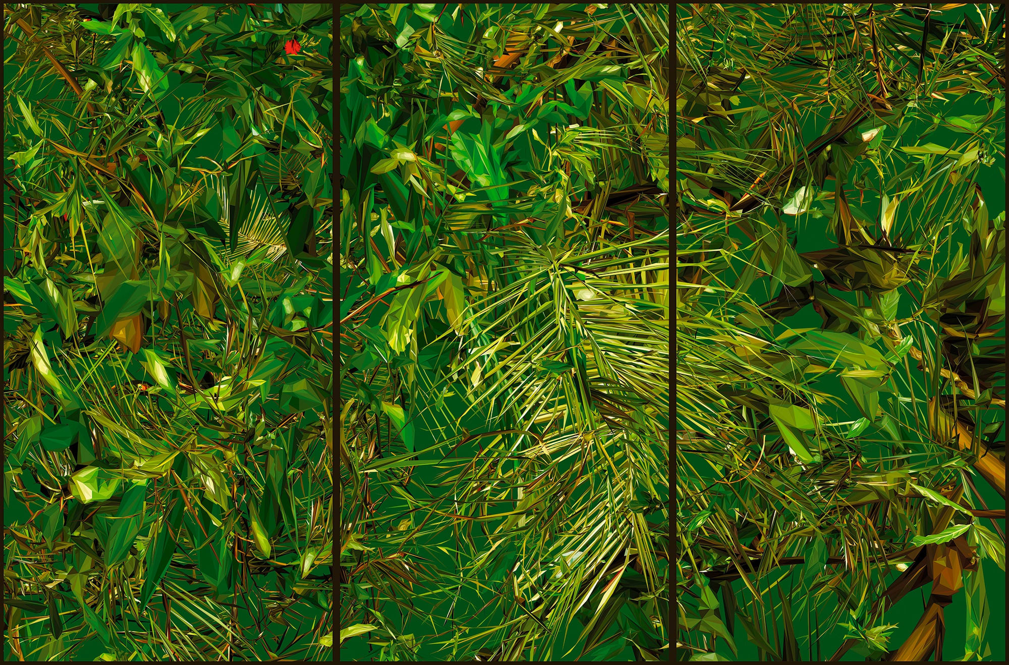 (SÃO PAULO, BRASIL, 1964)Albano Afonso produz em suas obras uma reflexão sobre a tradição da história da arte. Seus trabalhos partem dos gêneros e temáticas provenientes principalmente da história da pintura, em que, não por coincidência, a questão “luz e sombra” se apresenta como elemento central [...] Brilho, reflexo e refração se tornam objeto de estudo e assunto das obras. Na série Cristalização da paisagem, fotografias de paisagens, entre parques, matas fechadas e imagens históricas, se cristalizam. São imagens trabalhadas digitalmente pelo artista para se converterem em geometria e cor. É como se a luz rebatida pela natureza ganhasse corpo e se concretizasse em massas de cristais coloridos, que por vezes se apresentam sutilmente [...] Não há mais perspectiva possível ou ilusão de acesso. A paisagem antes permeável agora é matéria sólida.