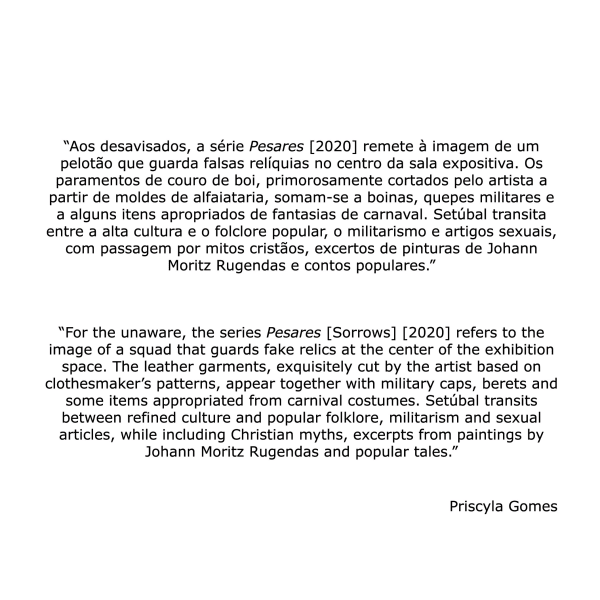 CASA TRIÂNGULO TEM O PRAZER DE APRESENTAR BRONZE, COURO, OURO, SANGUE, PRIMEIRA EXPOSIÇÃO INDIVIDUAL DE PAUL SETÚBAL NA GALERIA. os matEriais que compõem o título e as obras da exposição evidenciam um país historicamente arrasado pelas promessas de progresso e que perpetua, em seu sistema de poder e formação, regimes de violência e autoritarismo. Contendo referências históricas e da vida cotidiana, a exposição é ao mesmo tempo um olhar para o passado e para o presente.