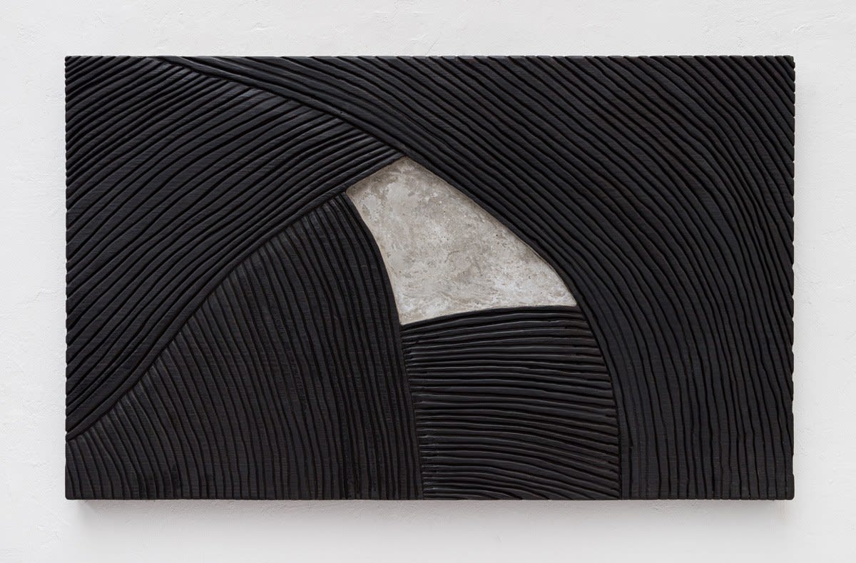 The second stage unavoidably involves fire. By burning these sculpted wooden reliefs, the artist imbues them with robust black tones, which are then bathed in unconventional materials such as grease and wax, resulting in a polished finish with nearly startling highlights on the dark tones.