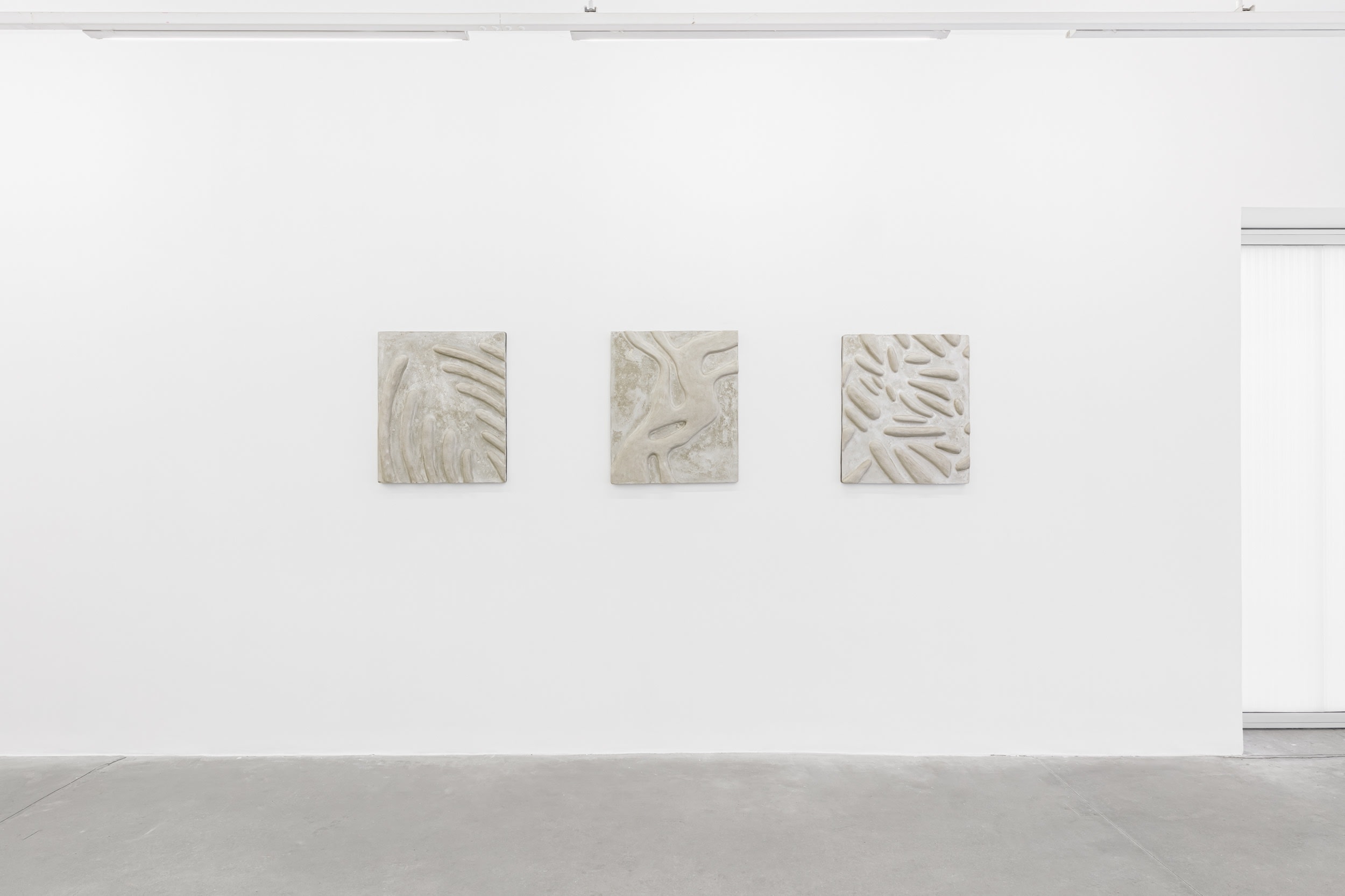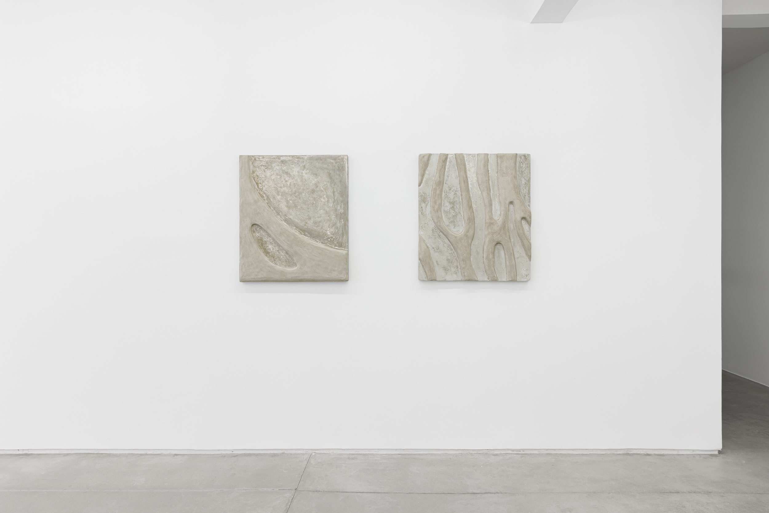 This is revealed, for example, by the three sculptures located away from the walls, looking like fugitive creatures that have broken free from the smooth, white surfaces that surround us. Like rocks, they rest on the space with a brutal lightness, evidencing the great formal complexity achieved by the artist’s unique work process.
