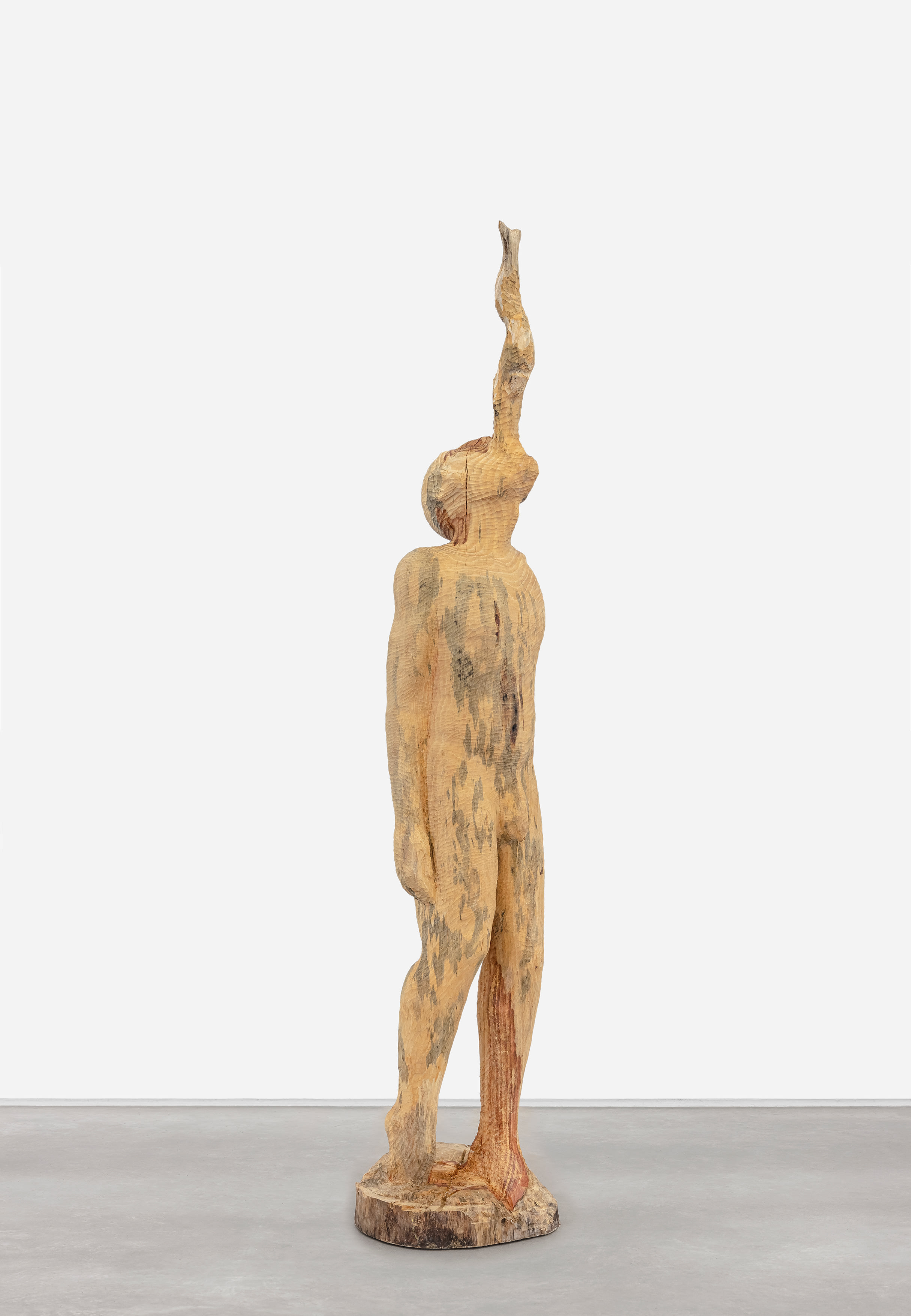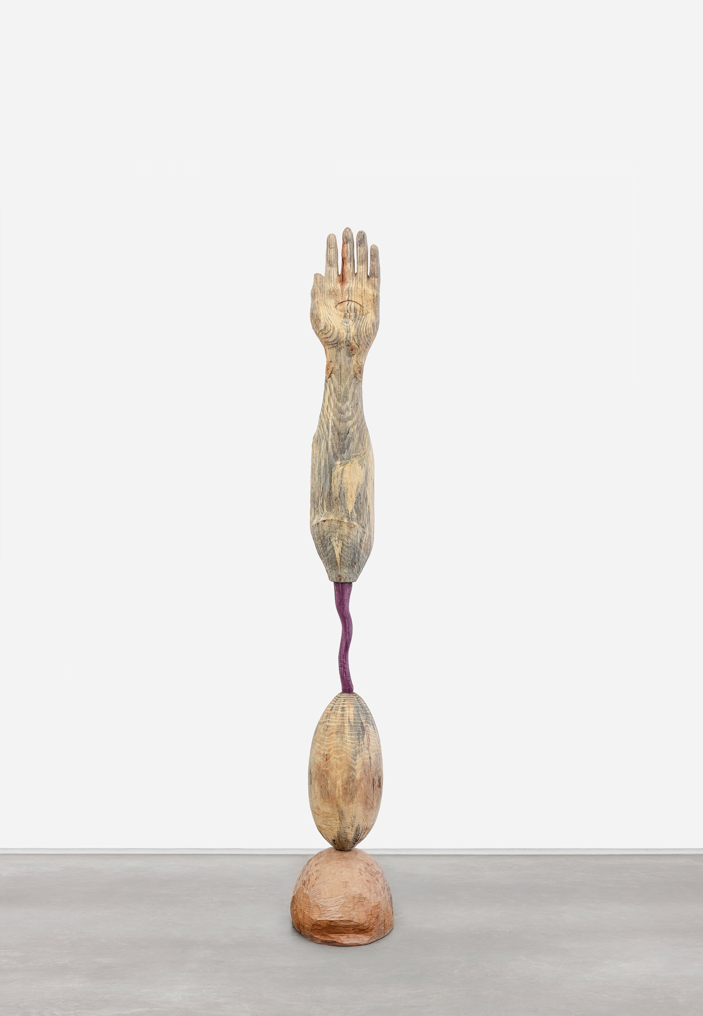 Certain works bear archetypal traits, as in Monada [Monad] – where a vertically positioned forearm and hand, with an eye in its palm, are held high on a staff of purpleheart perched atop an oval base. Garcia regards it as the exhibition’s most powerful singular element, the point toward which everything converges. In scientific usage, “monad” also denotes a simple, active, indivisible substance from which all beings are formed. These fantastic creatures, emerging from logs, trunks, and branches with their knots, veins, sinuous outlines, colors, and densities, echo the proto-surreal universe of Hieronymus Bosch.